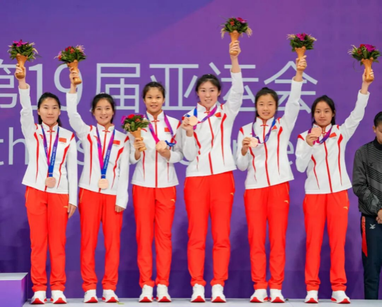 第十九届亚运会藤球项目铜牌获得者周佳雯(左二)、陈艳(右二)