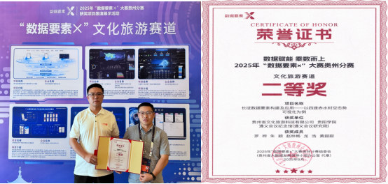 8月28日,2025年“数据要素×”大赛贵州分赛颁奖仪式在数博会期间圆满落幕。学校联合贵州省文化旅游科技有限公司、遵义会议纪念馆(遵义会议研究院)共同申报的“长征数据要素构建及应用——以四渡赤水时空态势可视化为例”项目,凭借在数据要素与文化旅游融合领域的创新实践,从众多参赛项目中脱颖而出,荣获文化旅游赛道省二等奖。
