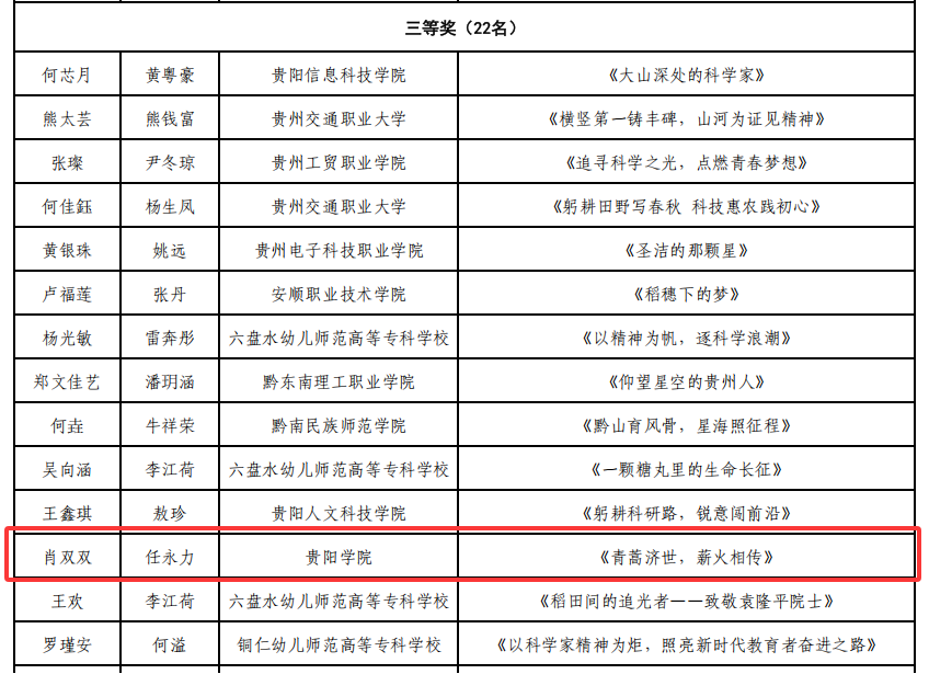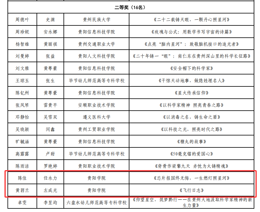 近日,贵州省科学技术协会近日公布了第三届贵州省弘扬科学家精神演讲大赛(大学组)一等奖、二等奖、三等奖公示名单。经初赛、学校推荐、专家复评、决赛等环节,学校师生团队在比赛中,获二等奖2项,三等奖1项。左成光老师指导的学生黄莙兰《飞行日志》作品荣获二等奖;任永力老师指导的学生陈佳《芯片报国终无悔,一生燃灯照星河》作品获二等奖,学生肖双双《青蒿济世,薪火相传》作品获三等奖。