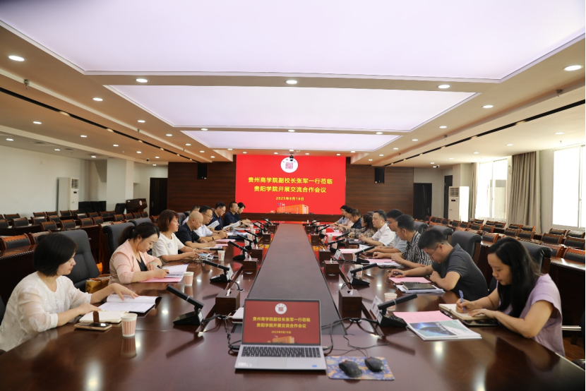 9月18日,贵州商学院党委书记汤健、校长肖小虹一行莅临学校,与贵阳学院党委书记黄营,党委副书记、校长樊铁钢等举行交流座谈。双方围绕校际合作、知识产权人才培养、学科专业建设等方面进行了深入探讨,为两校下一步落实具体合作项目奠定了坚实基础。双方相关人员参加了在贵阳学院九思楼八楼会议室举行了交流合作会。