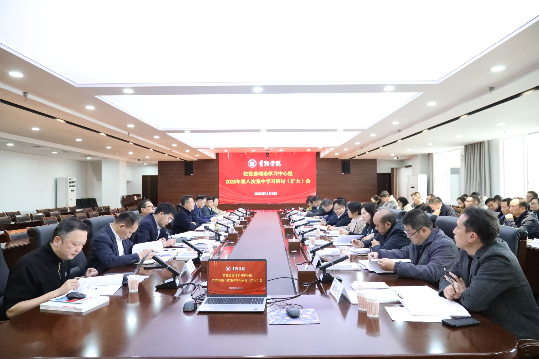 为学习宣传贯彻好党的二十届四中全会精神,11月5日,校党委理论学习中心组在九思楼八楼会议室举行2025年第八次集中学习研讨(扩大)会。会议集中学习了习近平总书记在党的二十届四中全会上的重要讲话精神,《中国共产党第二十届中央委员会第四次全体会议公报》等,围绕“深入学习贯彻党的二十届四中全会精神,切实把思想和行动统一到党中央决策部署上来,以全会精神为引领,加快建设以数智科技为特色的区域高水平应用型大学”为主题进行学习研讨。会议研究部署学校宣传贯彻落实全会精神相关工作,研究部署学校“十五五”发展规划工作。校党委书记黄营主持会议并讲话。