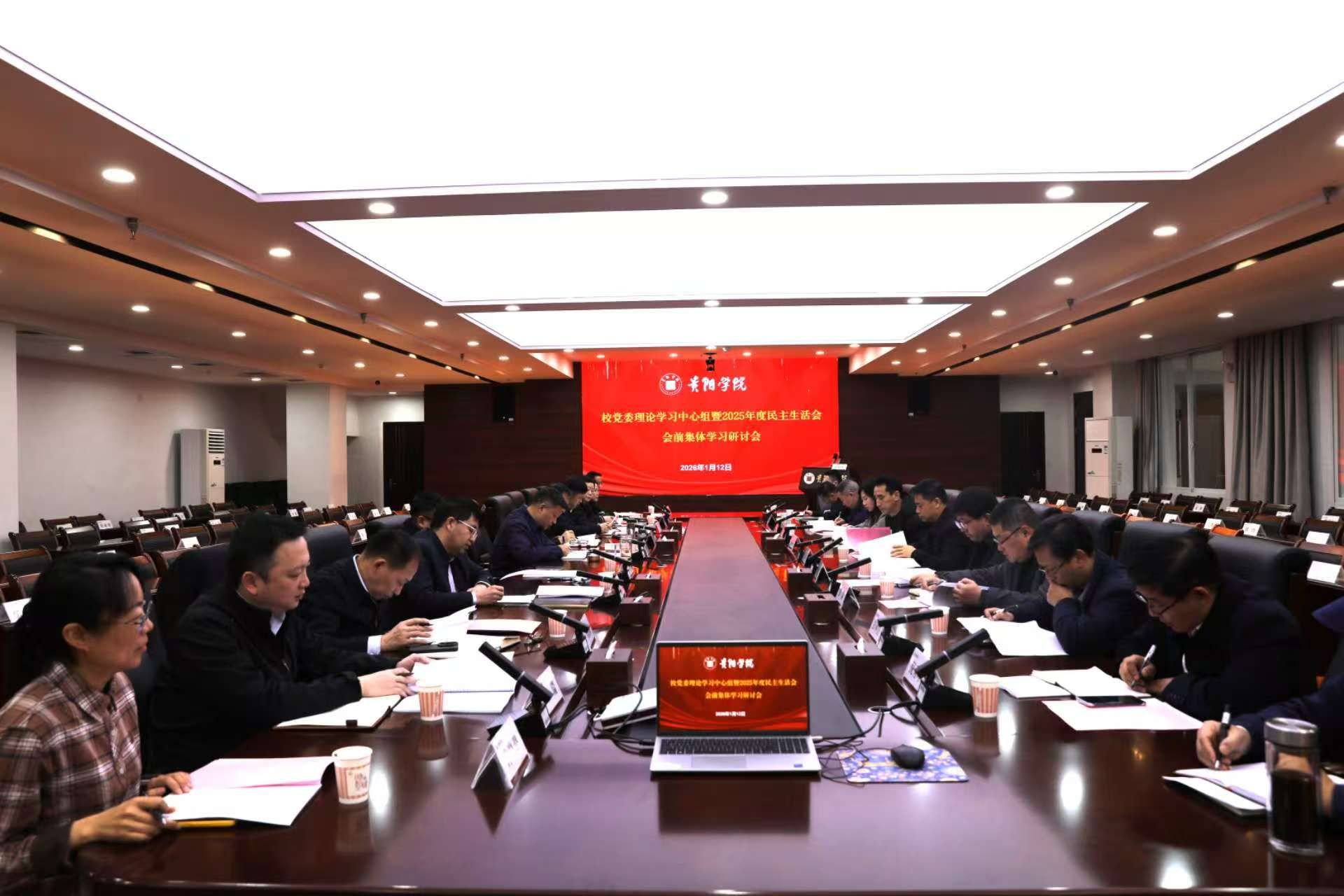 1月12日上午,学校党委理论学习中心组暨2025年度民主生活会会前集体学习研讨、调研交流会在九思楼八楼会议室召开。黄营同志主持会议并讲话。他强调,要深入学习贯彻习近平新时代中国特色社会主义思想,全面贯彻落实党的二十届四中全会精神,锲而不舍落实中央八项规定及其实施细则精神,推进作风建设常态化长效化;要大力弘扬实干之风、担当之风,切实把学习成果转化为推动事业发展的实际成效,努力在中国式现代化贵州实践的新征程中贡献贵院智慧、展现贵院作为、开创贵院高质量发展新局面。