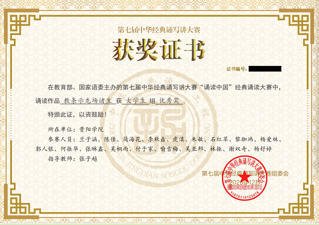 近日,由教育部、国家语委主办的第七届中华经典诵写讲大赛“诵读中国”全国总决赛获奖名单正式公布,我校报送的作品《教条示龙场诸生》荣获大学生组“优秀奖”。此佳绩体现了我校在推动中华优秀传统文化传承与阳明文化转化运用中取得的扎实成效。