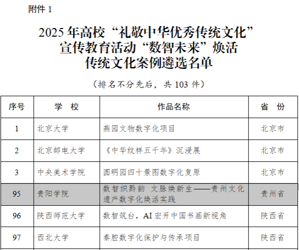 近日,教育部办公厅公布了2025年高校“礼敬中华优秀传统文化 ”宣传教育活动结果,学校推送的作品《数智织黔韵 文脉焕新生——贵州文化遗产数字化焕活实践》,成功入围“数智未来”焕活传统文化案例遴选名单。